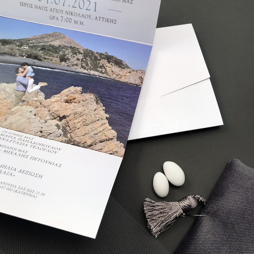 Οικονομικό τρίπτυχο προσκλητήριο με μεγάλη φωτογραφία στην εσωτερική όψη. Κλείνει με πρακτική εγκοπή χωρίς να χρειάζεται αυτοκόλλητο.
